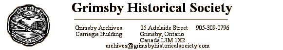 Visit us on Adelaide Street, Grimsby or direct your correspondence to Grimsby Historical Society Archives, P.O. Box 294, Grimsby, Ontario L3M 4G5 (905) 309-0796